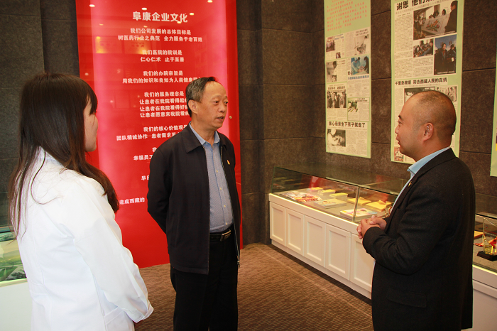 在阜康醫(yī)院五樓院史館,劉連福向劉家杰一行介紹了阜康醫(yī)療不平凡的發(fā)展歷程以及阜康人在黨的建設(shè)、抗震救災(zāi)、公益事業(yè)、企業(yè)文化等方面的成就,劉家杰一行對阜康醫(yī)療各方面的工作表示充分認(rèn)可并對"阜康”中所含的物阜民康——"物產(chǎn)豐富,民族安康”之意表現(xiàn)出極大的興趣,希望通過阜康人在醫(yī)藥領(lǐng)域的不懈努力,勇于攀登醫(yī)學(xué)高峰,為西藏的醫(yī)療發(fā)展貢獻(xiàn)力量。